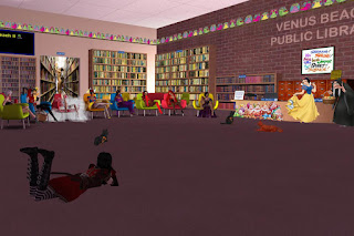 The "young at heart" gathered last evening in the VBII Library as a creative array of fairy tale characters and Avion spun magically-thematic music. Three tied for top honors: Cheryl in newly-popular dystopian garb, JoAnn with a shocking basketful of goodies, and Bea channeling Mussorgsky's "The Hut on Fowl's Legs." Shy opened the proceedings by reading a naughty version of Cinderella to an attentive audience.